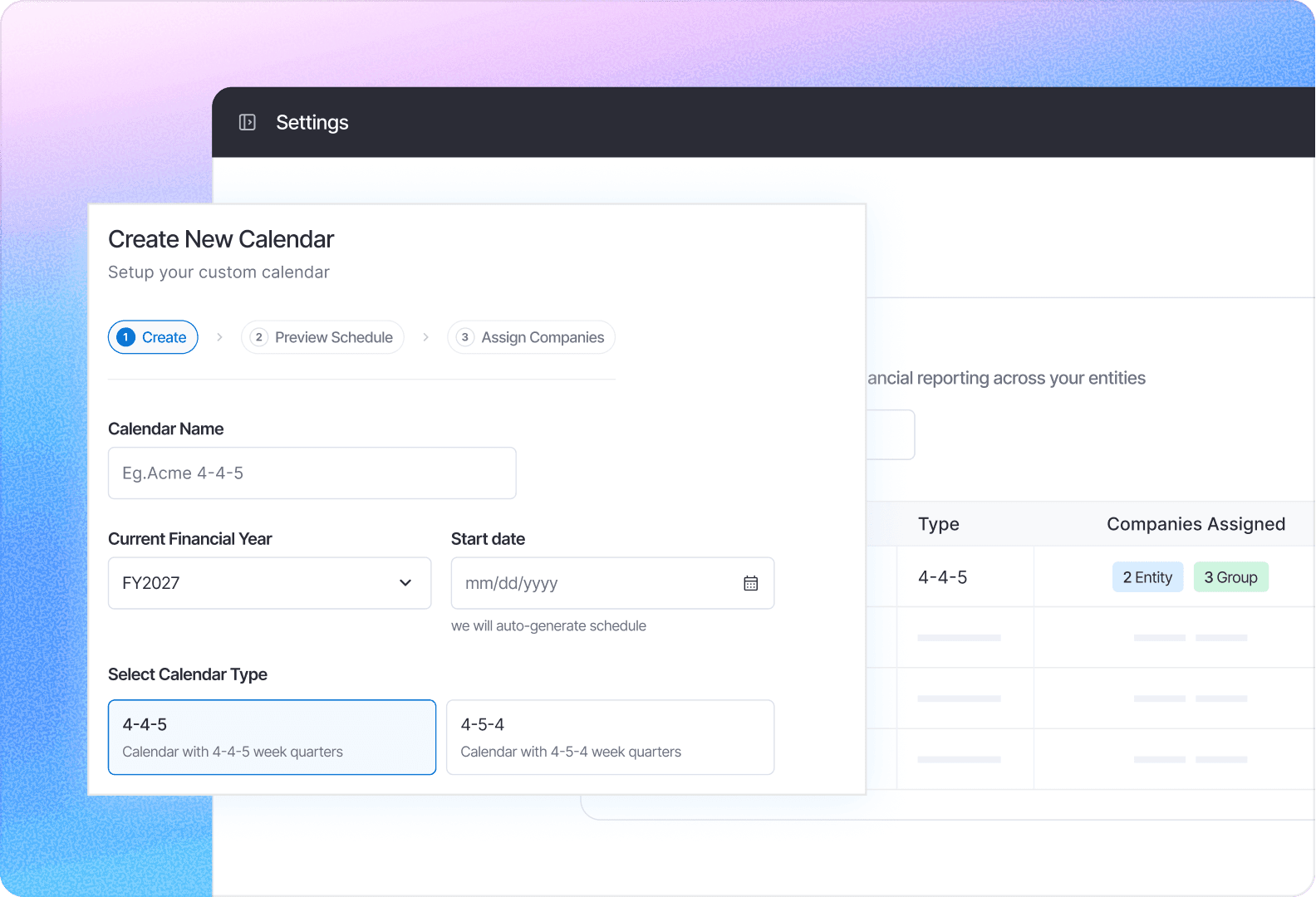 Built-in support for complex reporting periods like 4-4-5 and 4-5-4, with a standardized fiscal start date