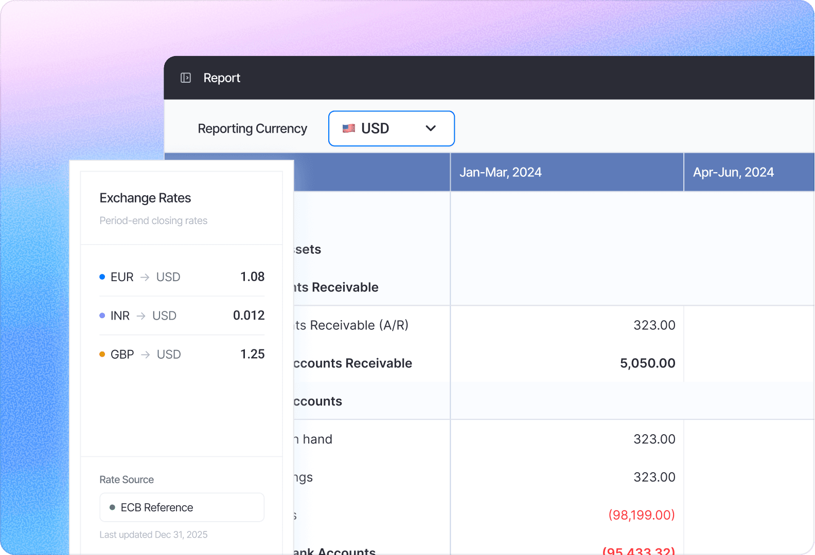 Define exchange rates at the report or transaction level, and post translation adjustments