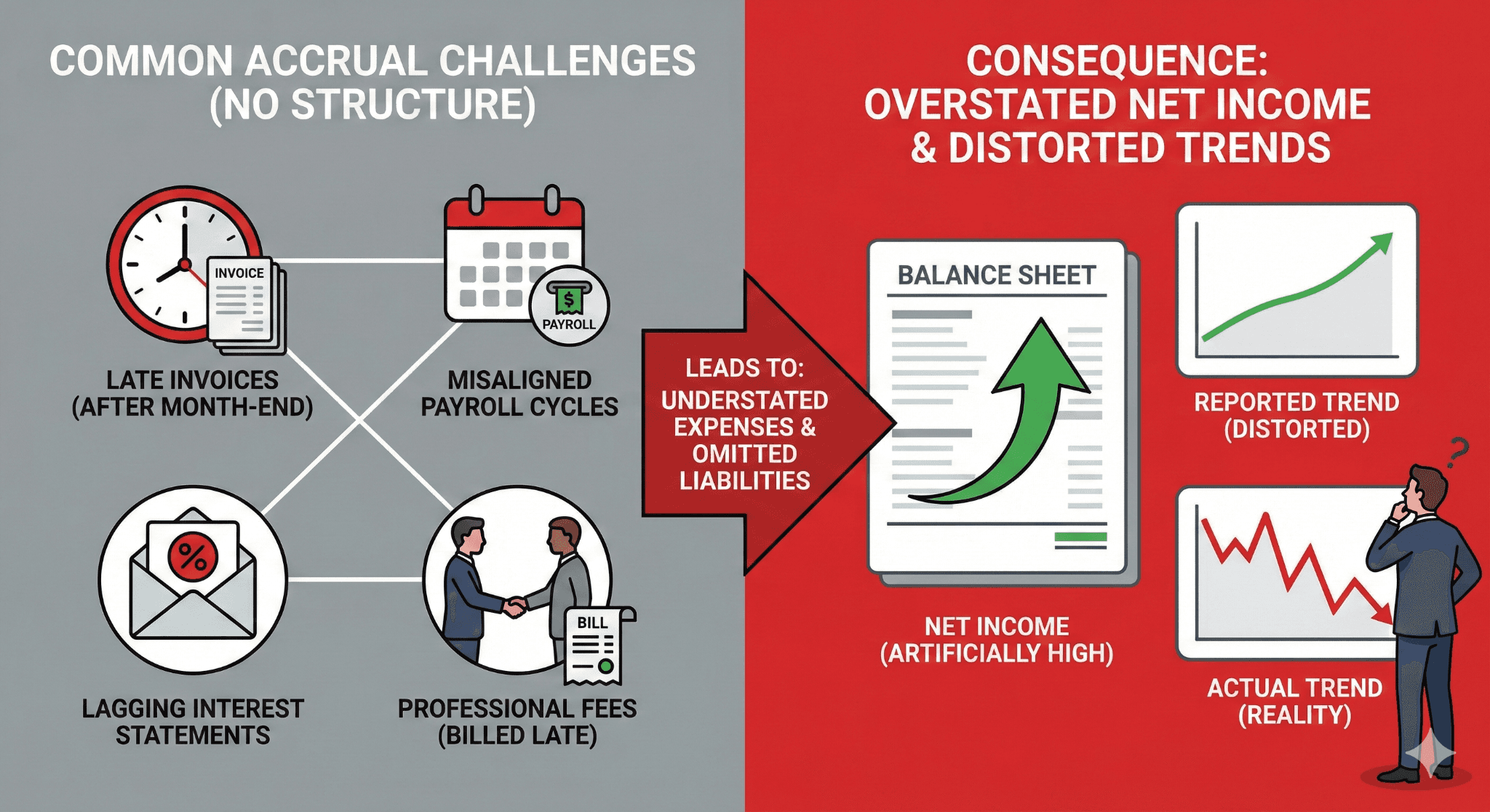 In small and mid-market businesses, invoices frequently arrive after month-end. Payroll cycles rarely align with calendar periods. Interest statements lag. Professional fees are billed after services are completed. Without structured accrual procedures, expenses are routinely understated and liabilities omitted. The result is overstated net income and distorted trend analysis.