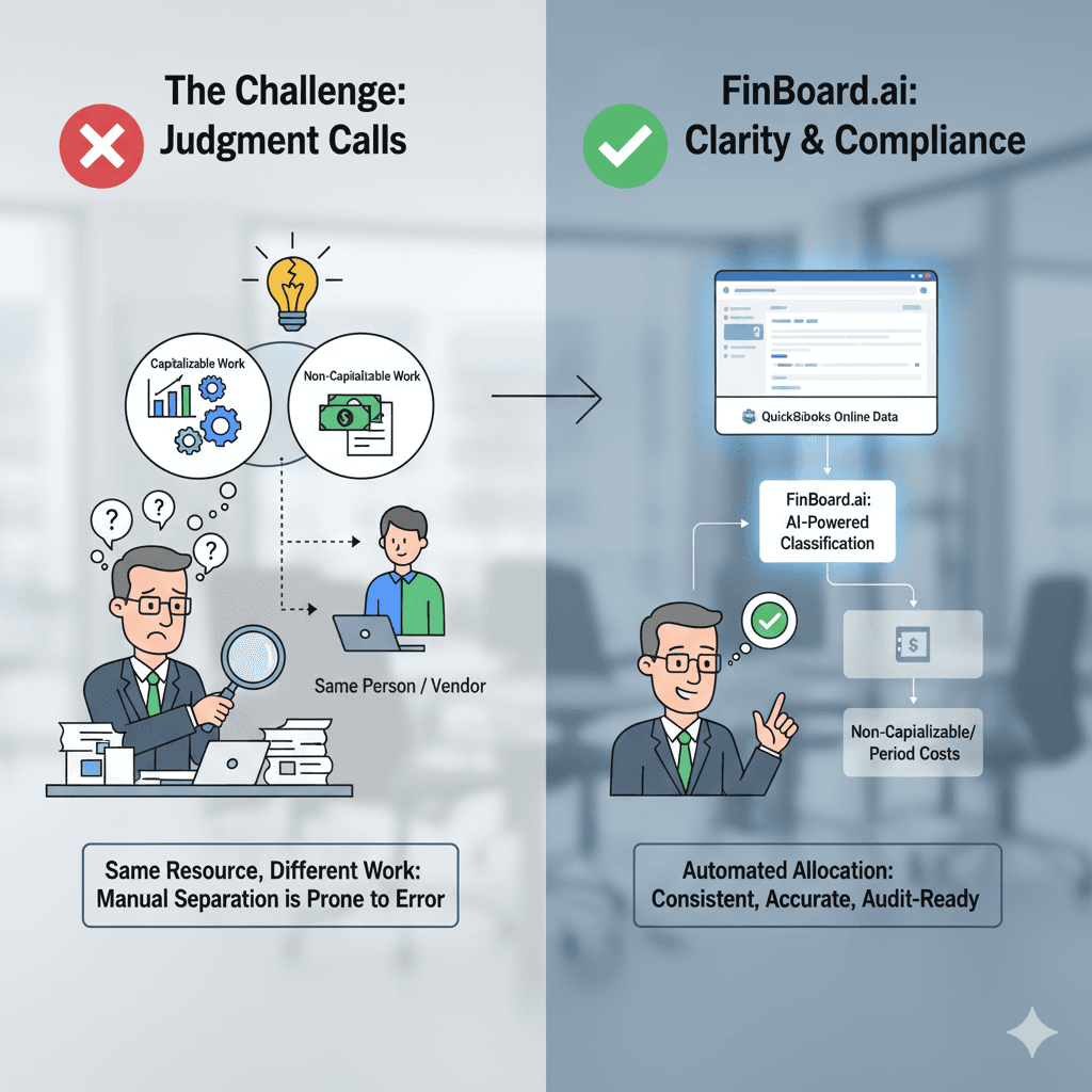 FinBoard.ai simplifies the work by pulling QuickBooks Online data, flagging capitalizable transactions, and building audit-ready documentation.