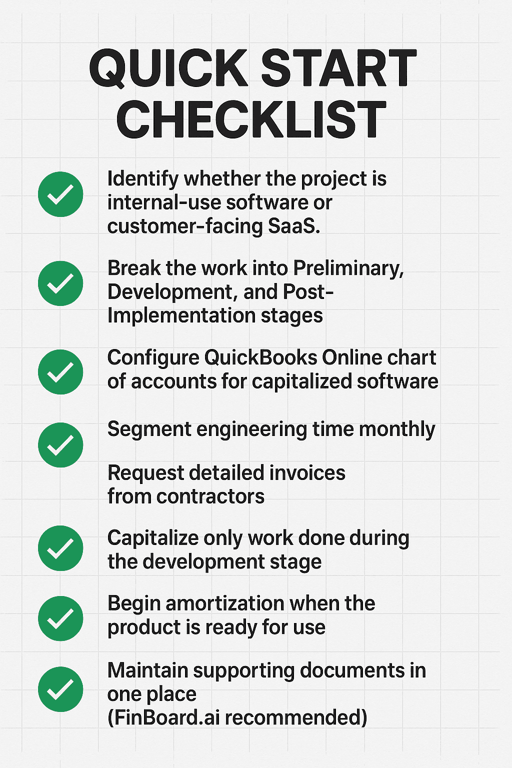 This guide explains, in practical SMB-friendly language, how to identify capitalizable software costs, when to expense them, how to document the decisions, and how to operationalize everything inside QuickBooks Online. Real SaaS scenarios are included, along with a QuickBooks Online-centric mini-case. FinBoard.ai’s automation capabilities are explained wherever they help streamline the workflow.