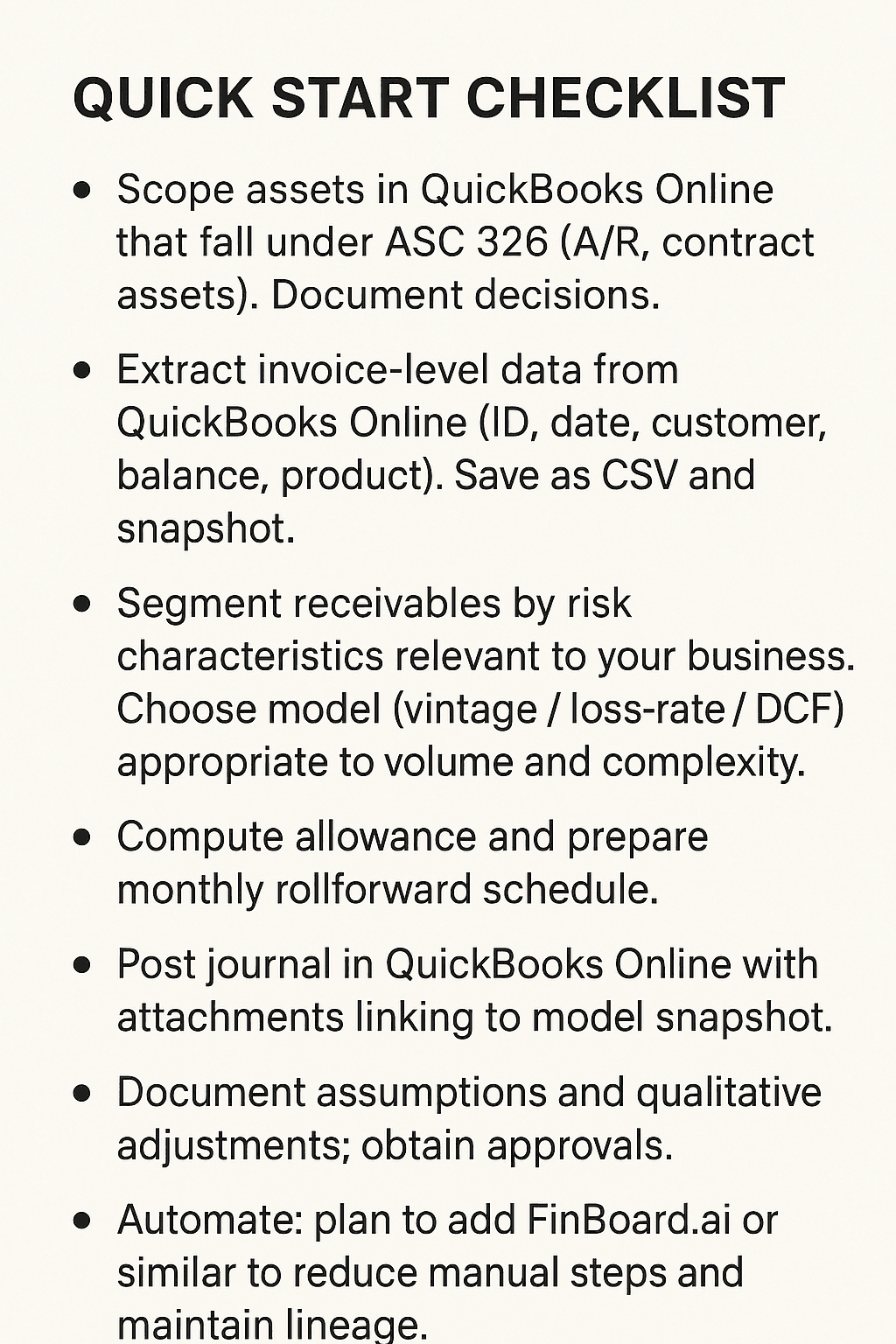CECL is a control- and data-heavy requirement. QuickBooks Online will be your source ledger, not your CECL engine. Build repeatable extract → model → post processes. Start simple, document everything, and introduce automation (FinBoard.ai or similar) before your portfolio outgrows spreadsheets. Use the references above when you design your model and keep your audit trail tight. The next reporting period will be easier if you make the work auditable today.