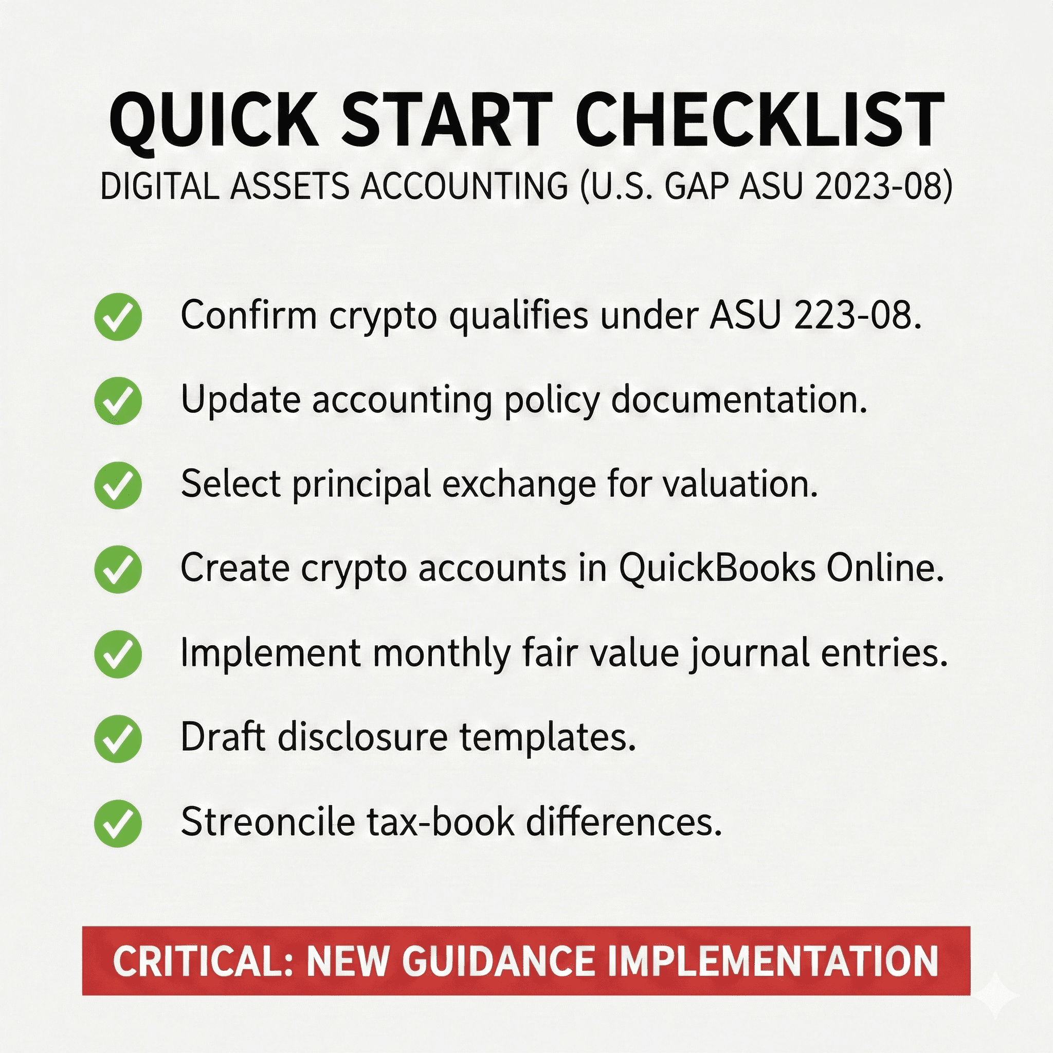 For SMB and mid-market entities, the accounting principles are clear. The challenge lies in implementation: valuation methodology, wallet reconciliation, gain tracking, internal controls, and disclosure. This guide explains the rules and provides practical case scenarios tailored for QuickBooks-Online heavy environments.