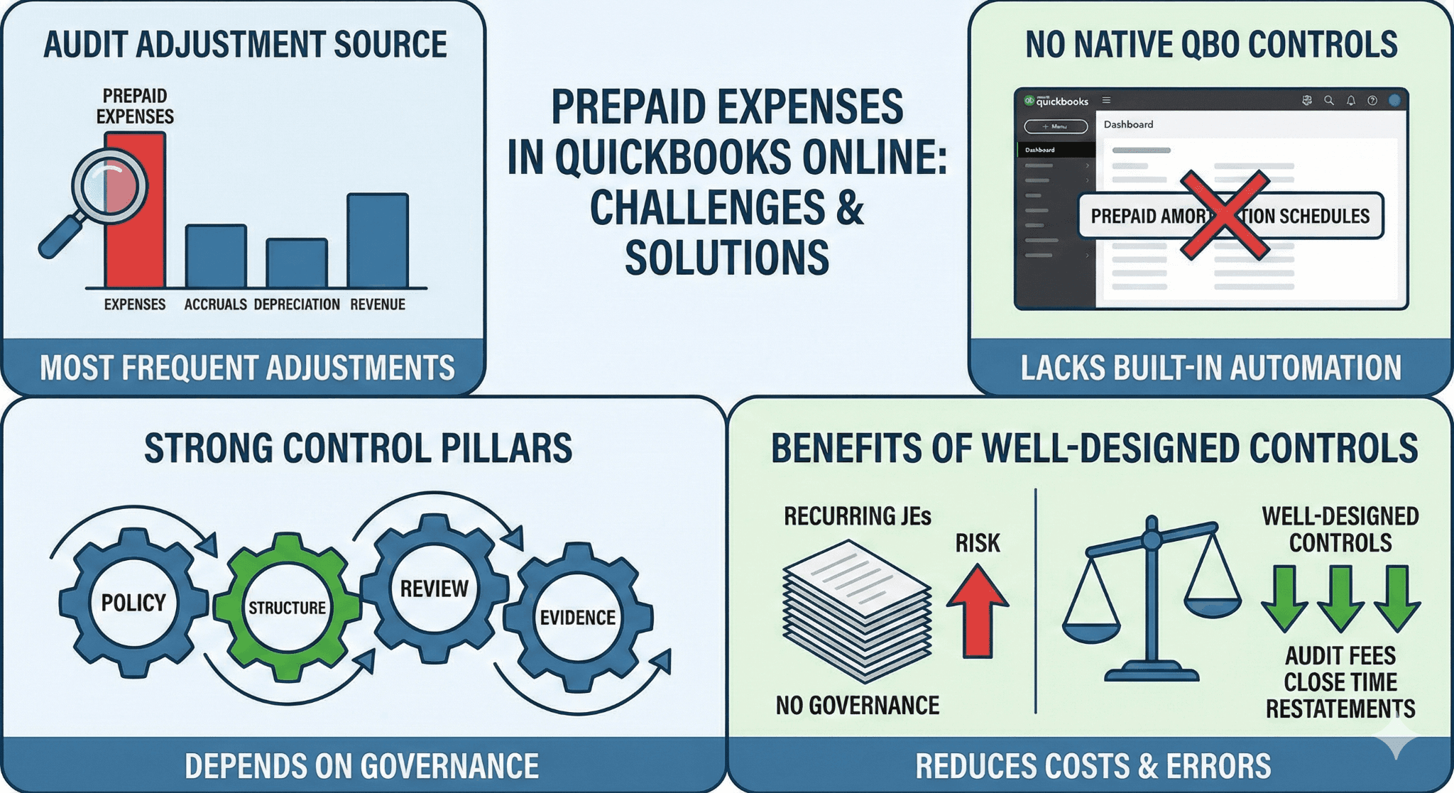 The root problem is not technical capability. It is a control design. QuickBooks Online prioritizes speed and simplicity. It does not enforce accounting discipline. As a result, prepaid expense controls must be intentionally designed and operationalized.