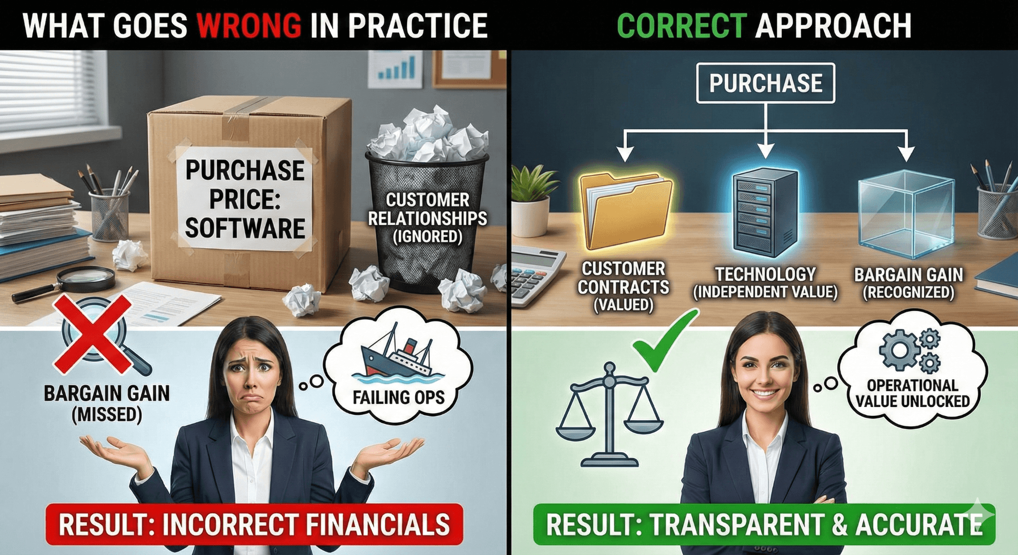 Failing to identify this correctly eliminates bargain purchase recognition entirely and misstates future amortization.