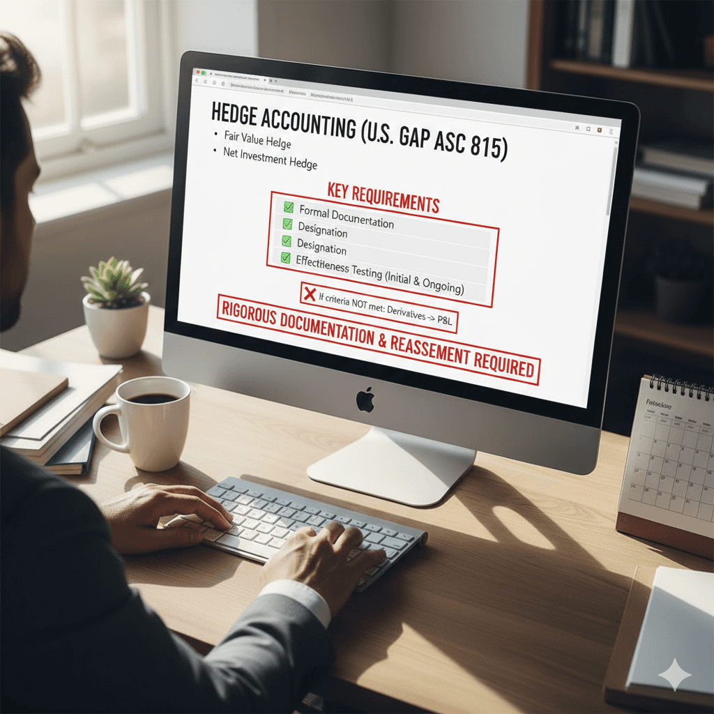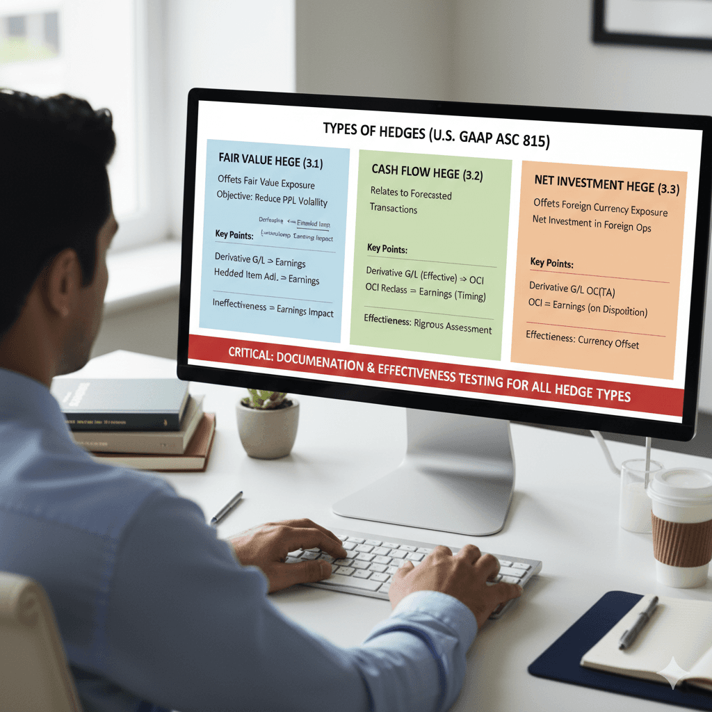 Under U.S. GAAP (ASC 815), entities can apply fair value, cash flow, or net investment hedge accounting.