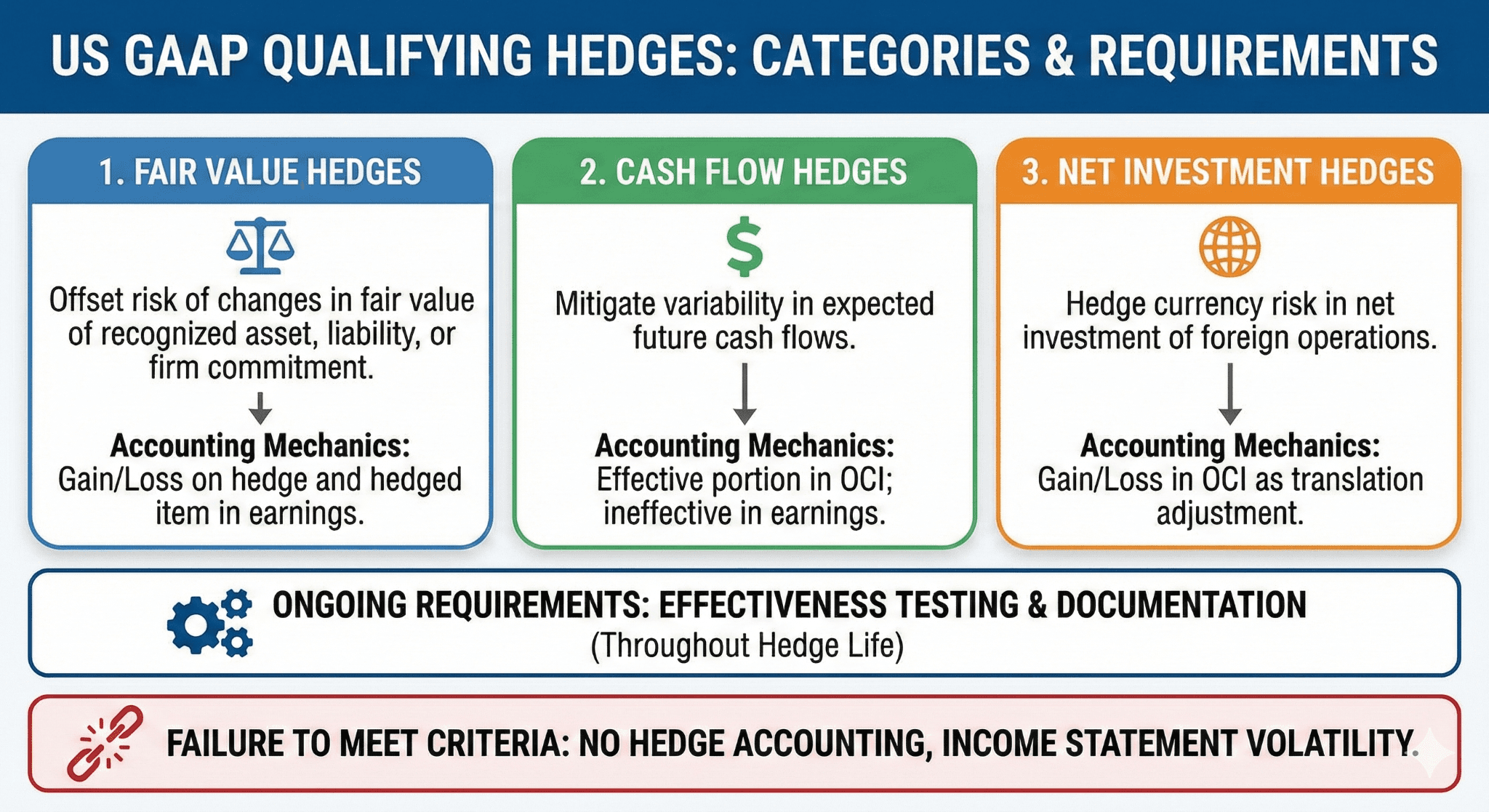 Under US GAAP, qualifying hedges generally fall into three categories: fair value hedges, cash flow hedges, and net investment hedges. Each type has distinct accounting mechanics and presentation requirements. Entities must perform ongoing effectiveness testing and maintain documentation to support eligibility throughout the hedge life. Failure to meet the qualifying criteria will preclude hedge accounting and expose an entity to income statement volatility unrelated to its core business performance.