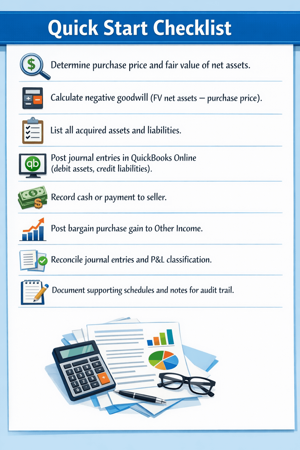 This article clarifies negative goodwill recognition in QuickBooks Online. It explains GAAP requirements, demonstrates manual journal entry processes, outlines reporting strategies, and provides checklists and mini‑case scenarios. Risks associated with workarounds are highlighted, and best practices ensure financial statements remain audit‑ready and compliant. By following the steps in this guide, finance professionals can handle negative goodwill in QuickBooks Online confidently, while minimizing errors and maintaining compliance with US GAAP.